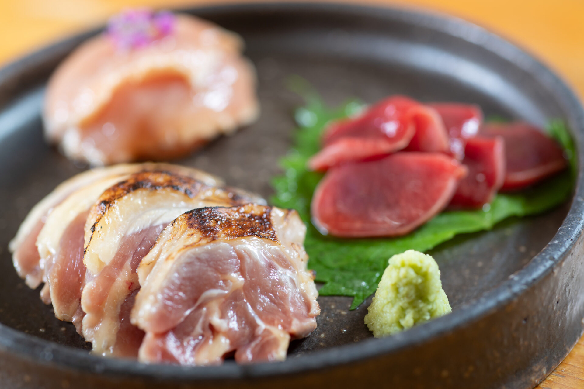 農場から丸ごと仕入れたほろほろ鳥を、当店の厨房で丁寧に捌き、刺身・たたき・焼串と様々な調理でご提供しています。鮮度の高さと、部位ごとに異なる豊かな風味をお楽しみください。